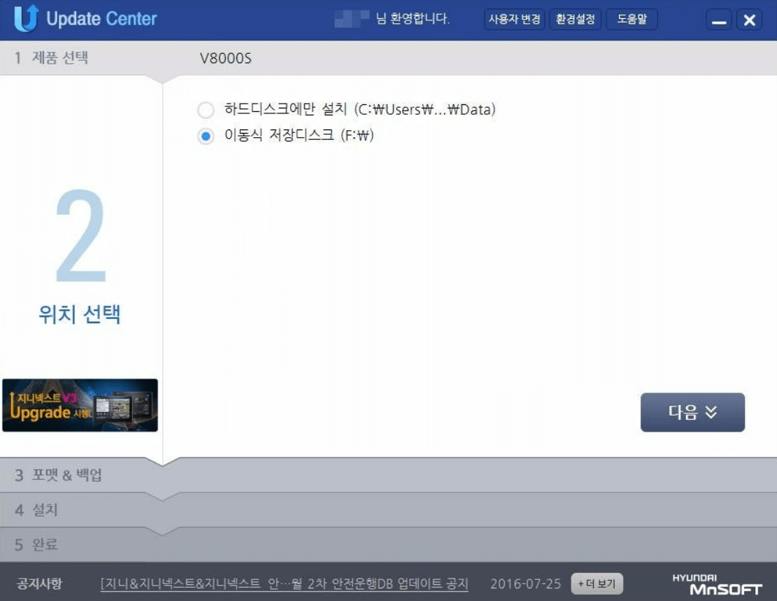 맵피 지도가 SD카드에 들어 가도록 이동식 저장디스크를 선택해주고 다음 버튼을 눌러줍니다.
