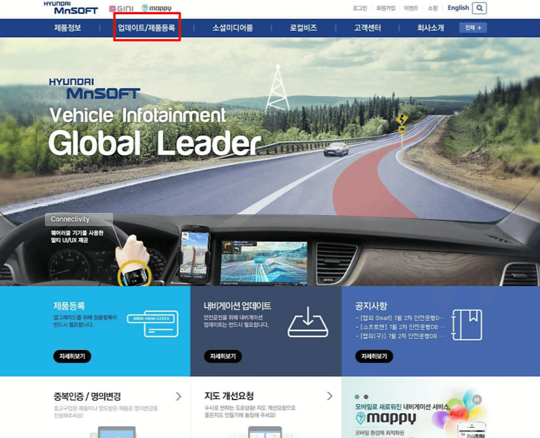 현대 엠엔소프트 홈페이지를 통해 mappy 맵피 지도를 업데이트하는 방법을 알려드리겠습니다. 맵피 업데이트는 현대 엠엔소프트 홈페이지에서 진행할 수 있으니 아래의 홈페이지에 접속하여 이어서 알려드리는 순서대로 업데이트 해 보세요.