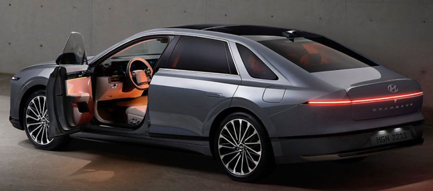 측면: 날카롭고 길어진 캐릭터 라인이 강조되어 역동성을 강화하며, 크롬 장식이 창문 테두리와 사이드 스커트에 더해져 고급감을 극대화합니다. 플러시 타입 도어 핸들이 차체와 일체감 있게 배치되어 현대적인 세단의 인상을 줍니다.